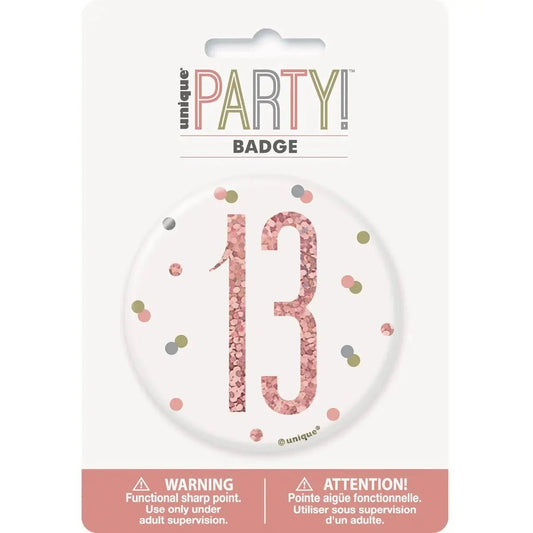 Glitz Rose Gold Birthday Badge 7.6cm (3") - 13th