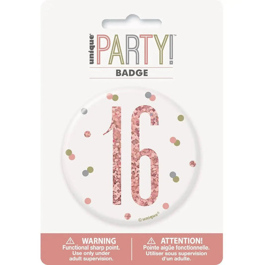 Glitz Rose Gold Birthday Badge 7.6cm (3") - 16th