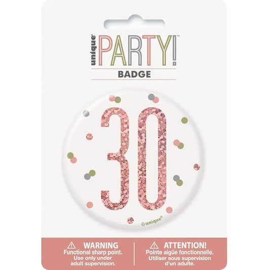 Glitz Rose Gold Birthday Badge 7.6cm (3") - 30th