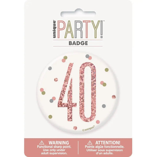 Glitz Rose Gold Birthday Badge 7.6cm (3") - 40th