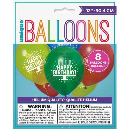 Happy Birthday Cake Latex Balloons 30cm (12") 8pk Assorted Colours