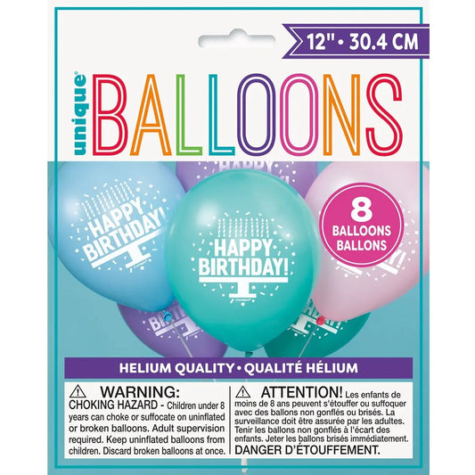 Happy Birthday Cake Latex Balloons 30cm (12") 8pk Assorted Pastel Colours